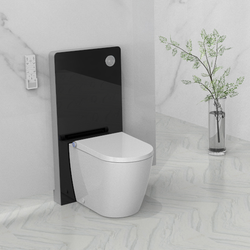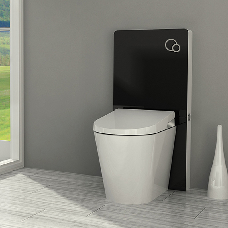 De luxe en verre réservoir avec de l'aluminium matériels cadre, adapté pour les murales de toilette; Capcitive automatique de rinçage, 3/6L à double chasse d'eau; Super slim intégré E-bidet: laver, massage, sec, la désodorisation, la airfresh, lumière de LED, buse réglable, avec télécommande.